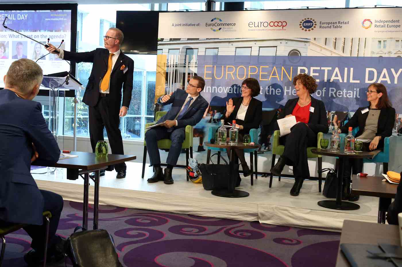 The moderator, Joe Lynam, presenter at BBC, challenged the panels on how industry and policy are tackling sustainability and digitalisation within the retail sector. There was a buzz created on stage with a consumer representative (Monique Goyens, Director General, BEUC) who voiced the concerns and opinions from consumers to the retailers.